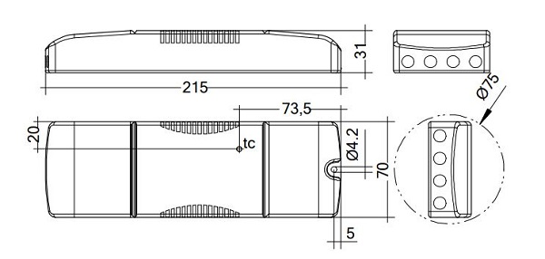 Tridonic 28000701 LEDdriver LC 45W 500-1400mA flexC SR EXC opbouw met trekontlasting uitgangsstroom tussen 500 en 1400mA instelbaar met ready2mains programmer of I-select 2 weerstanden zonder weerstand is de uitgangsstroom ingesteld op 500mA