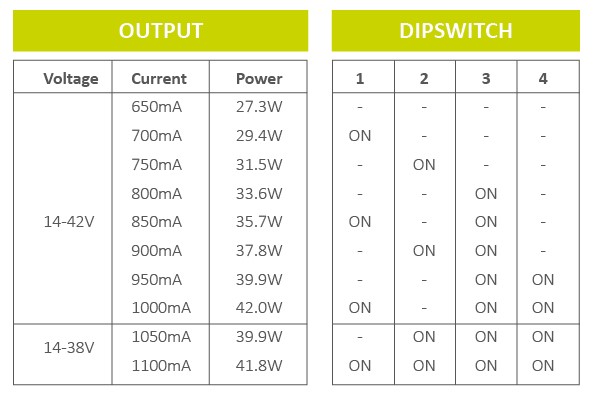LED stroomsturing 650mA 9,1-27,3W, 700mA 9,8-29,4W, 750mA 10,5-31,5W, 800mA 11,2-33,6W, 850mA 11,9-35,7W, 900mA 12,6-37,8W, 950mA 13,3-39,9W, 1000mA 14-42W, 1050mA 14,7-44,1W, 1100mA 15,4-46,2W